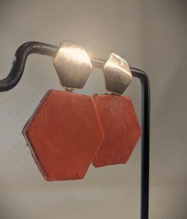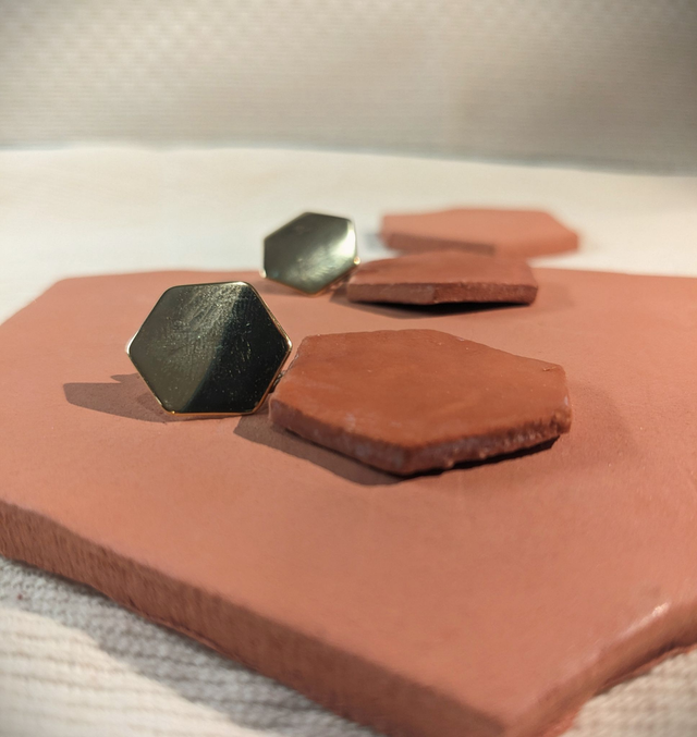 Faites d'argile, ces grandes tomettes sont montées sur des fermoirs hexagonaux à base de laiton doré à l'or 14K.