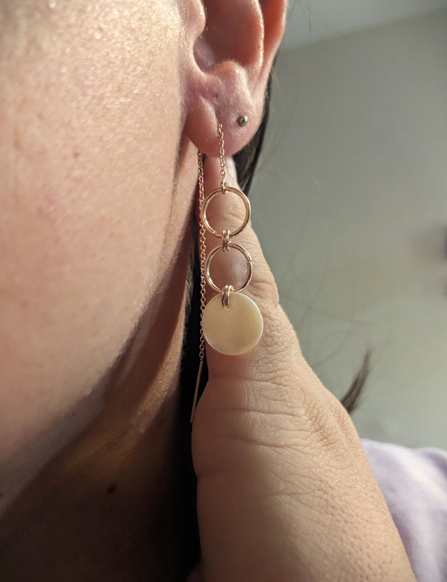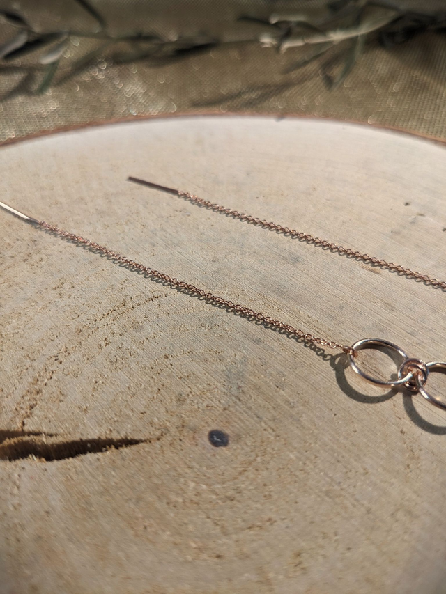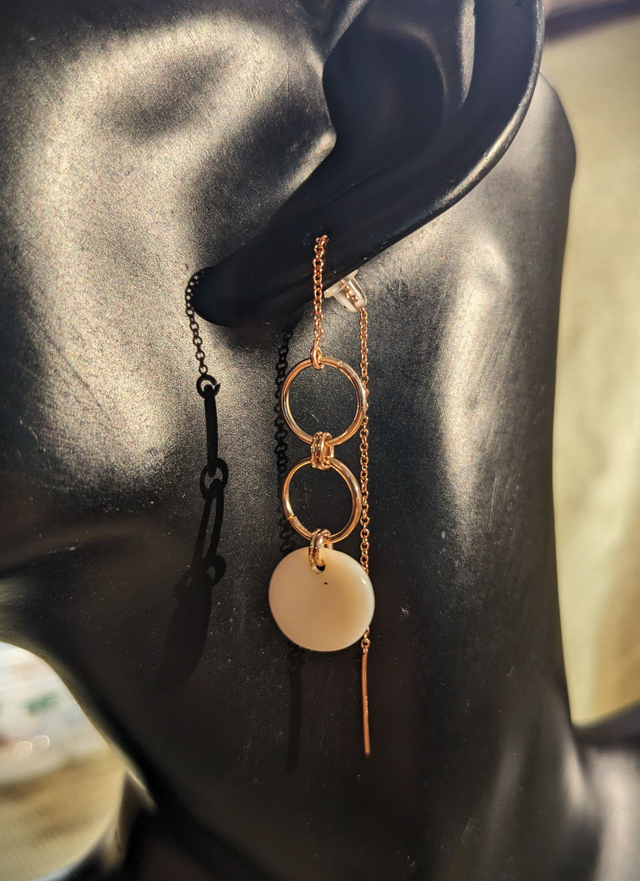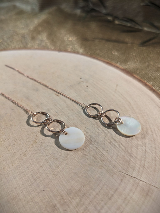 Cette paire de chainettes en Or Rose (or laminé), met en valeur des perles de Nacre blanche montées autour d'anneaux de laiton rosé.