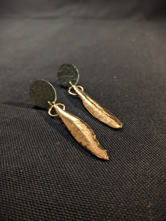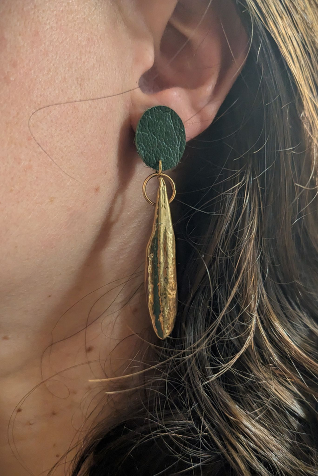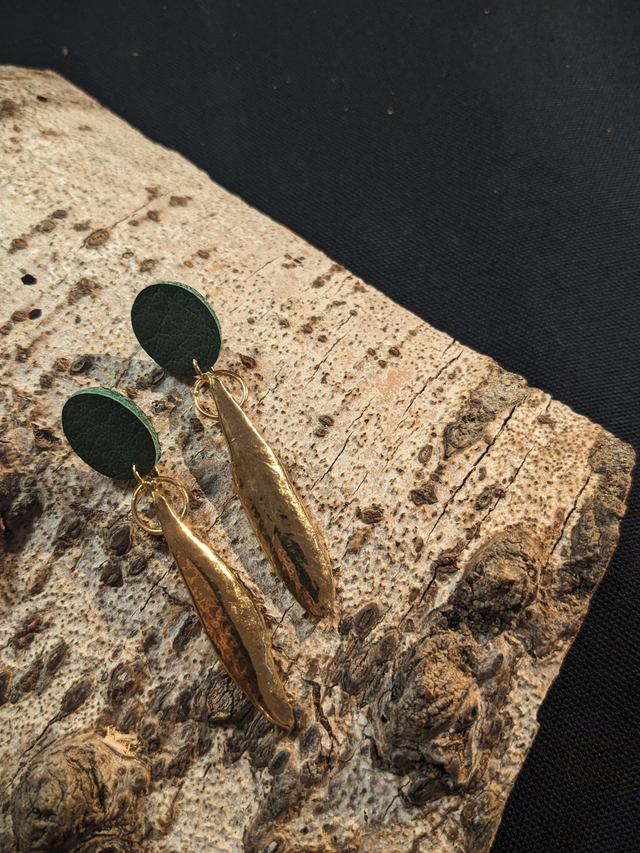 Montées sur un support en cuir de vachette fait à la main, ces boucles d'oreilles allient l’élégance naturelle de l’or à la texture authentique du cuir.