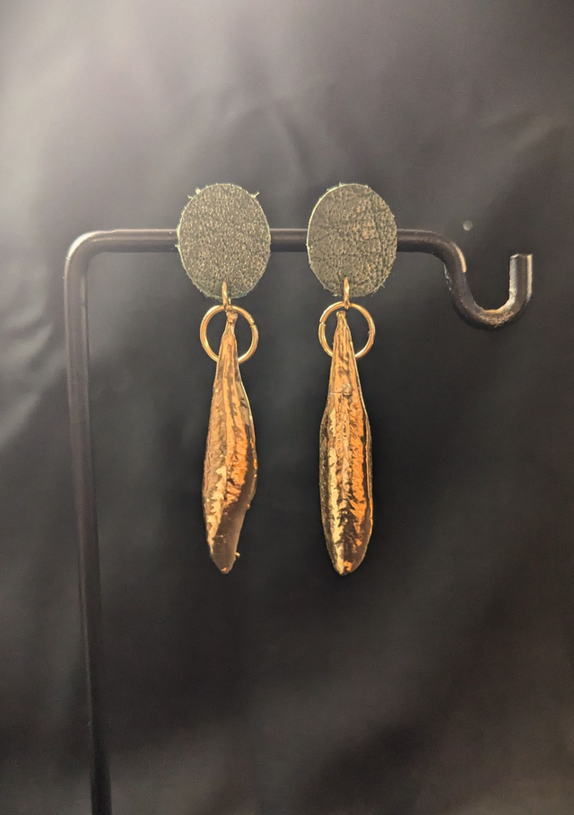 Laissez-vous charmer par cette paire de pendants d'oreilles uniques, mettant en scène de délicates feuilles d'olivier plaquées or 24 carats.