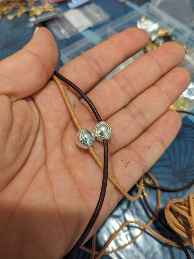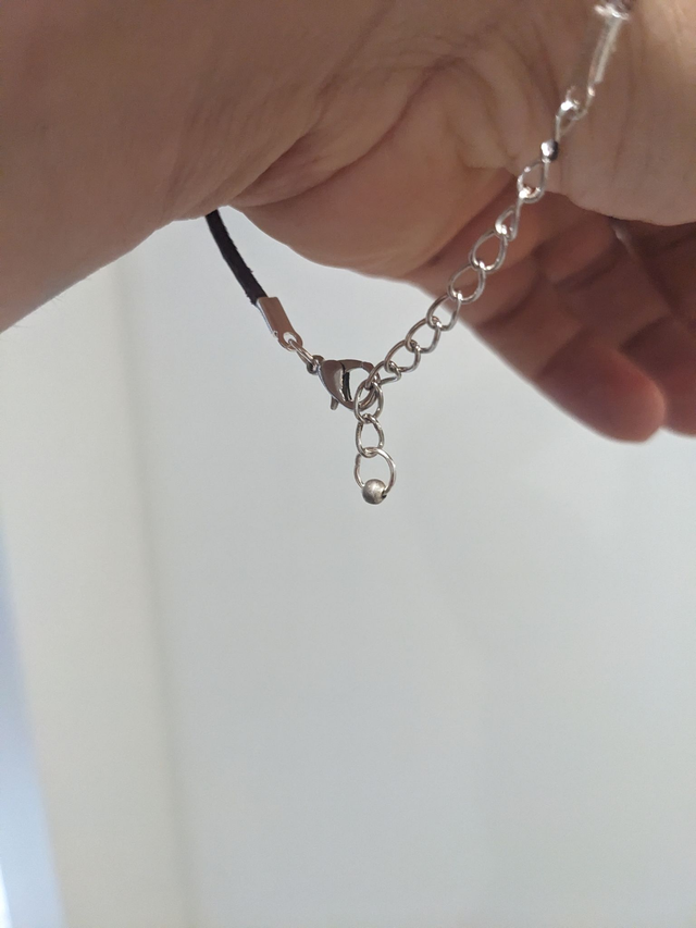plaquée argent, montée sur un lacet de cuir marron.